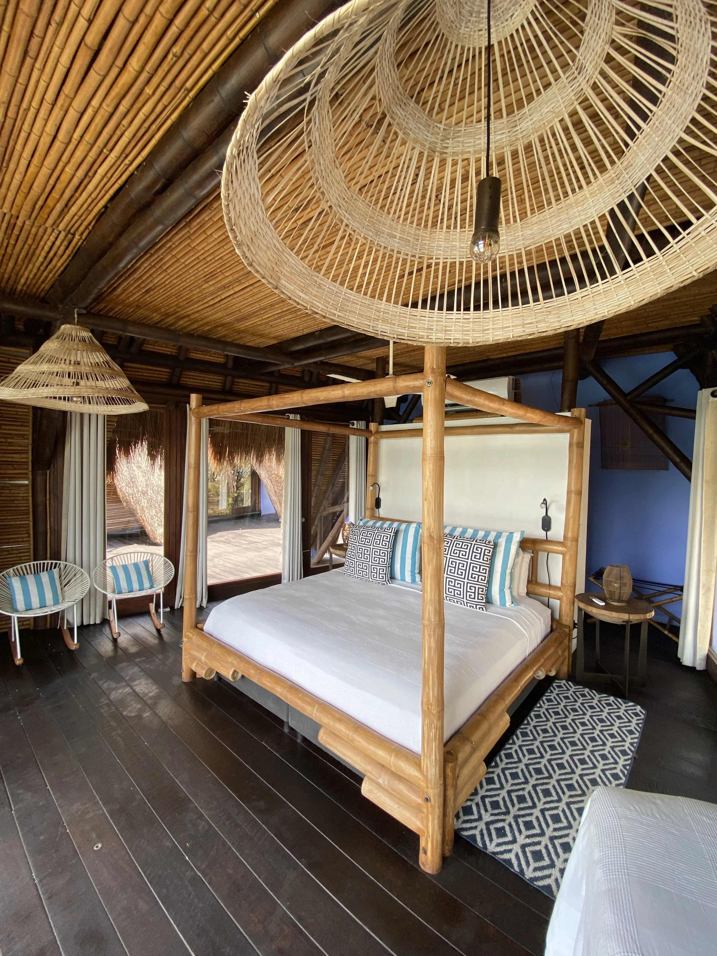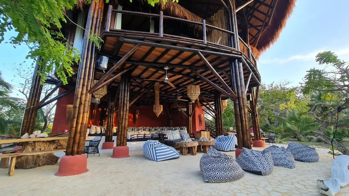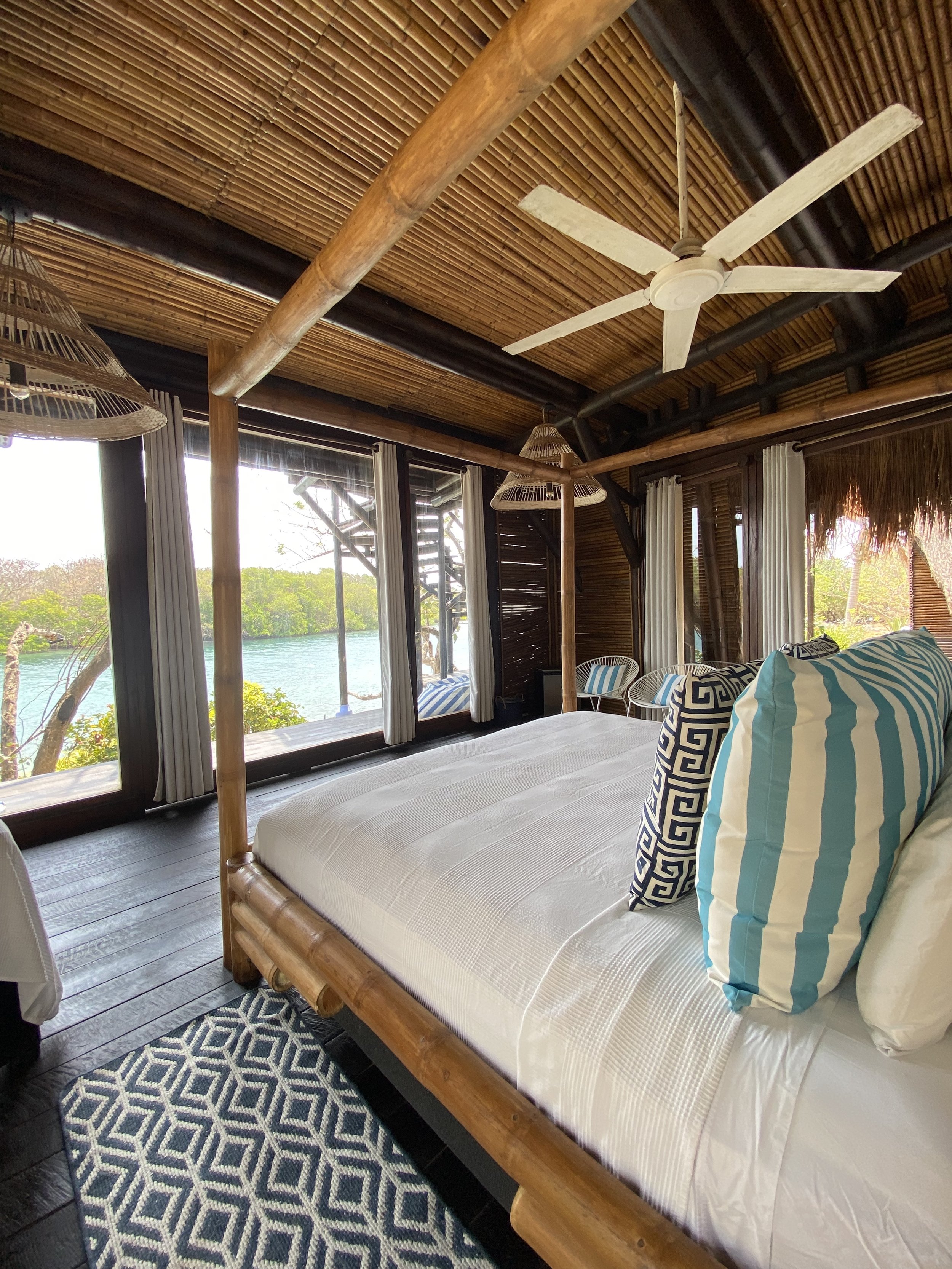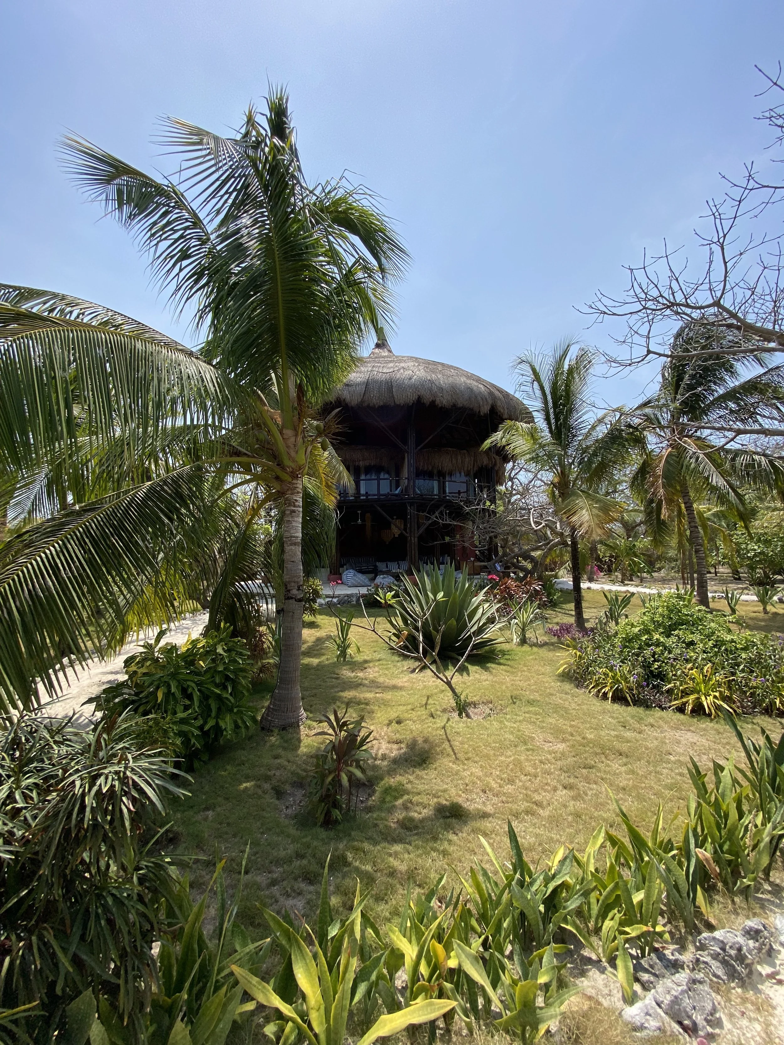 It’s six air-conditioned cabin blend seamlessly with the lush tropical landscape of coconut palms, native plants, and the island’s own organic garden.