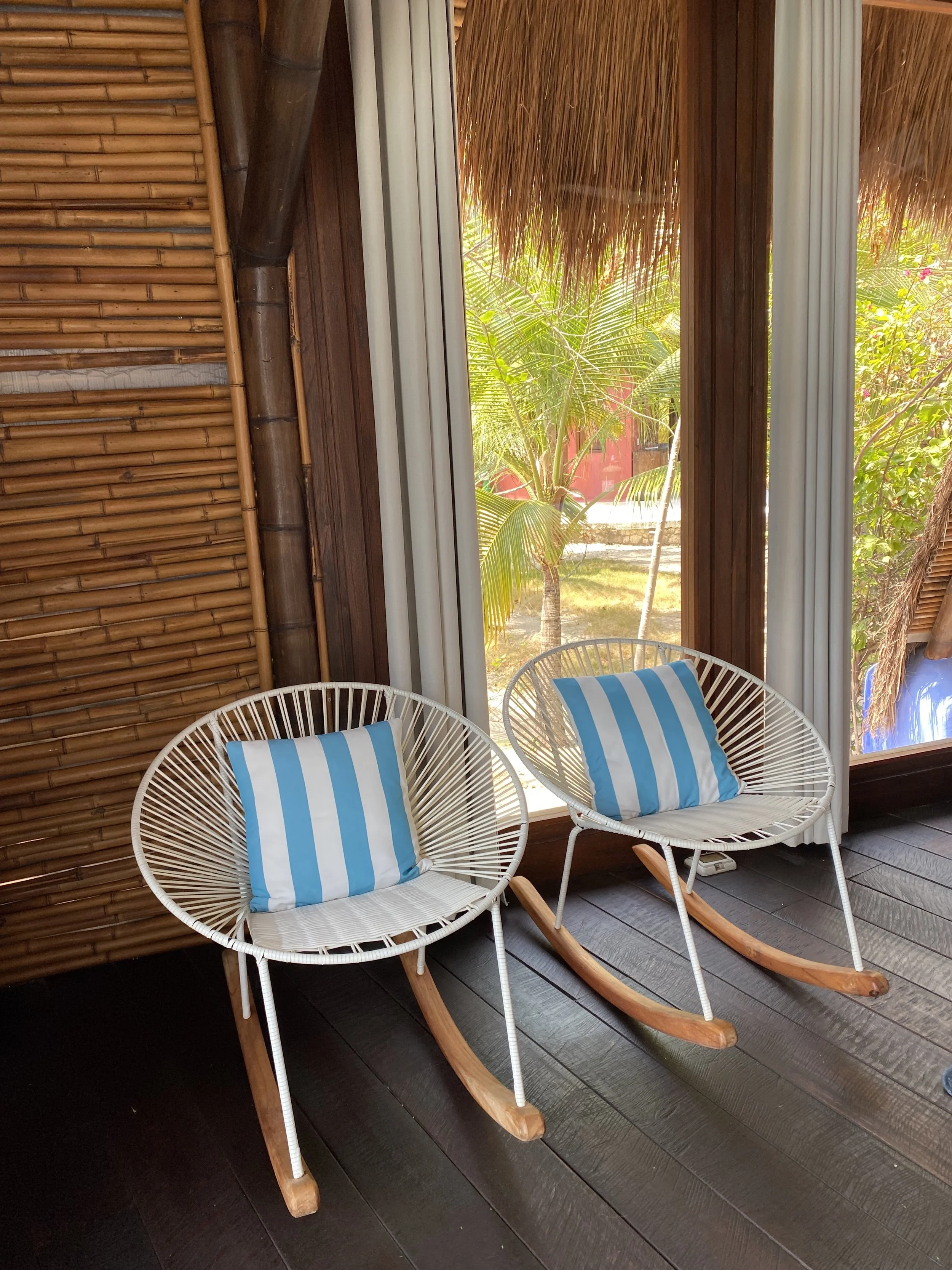 The practices take place in one of the outside palm roofed gathering spaces beside the water.